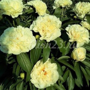 Гибрид. Цветок большой, диаметром 18-20 см, махровый, кремово-жёлтый, светящийся. Лепестки красиво сложенные. В центре жёлтые тычинки. Листья тёмно-зелёные. Стебли прочные, прямые. Куст высотой 90 см, быстро разрастается. Срок цветение средне-ранний.