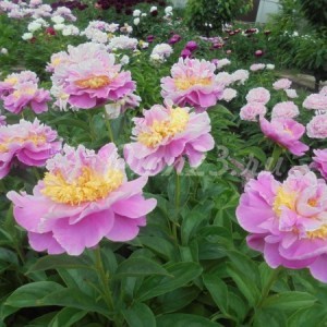Четыре-пять рядов округлых широких лепестков, лента желтых стаминодий, в центре фонтан из розовых лепестков.