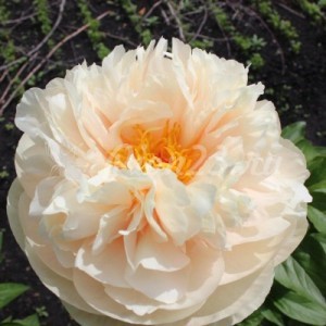 Шедевр! На сегодняшний день считается лучшим травянистым пионом американского селекционера Билла Сейдла. Окраска цветков уникальная, ни с чем не сравнимая. Гибрид. Цветок шикарный, диаметром 20-22 см, махровый, пастельный розово-персиковый с золотистыми тычинками повсюду среди лепестков. Внешние лепестки округлые, большие, окружают массу «взъерошенных» лепестков. В центре пучок тычинок окружает пестики с красными рыльцами. Листья тёмно-сине-зелёные, широкие, полуглянцевые. Стебли очень крепкие. Высота 75 см. Срок цветения средний.